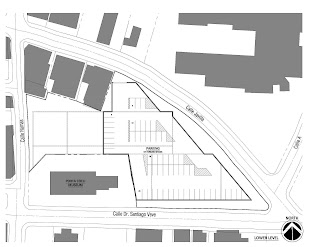 This is a Site Plan Diagram showing some points of interest in the historic district as well as transportation routes. The majority of the pedestrian movement around the site occurs in Dr. Santiago Veve St.(East-West). During special events like festivals or baseball games, pedestrian movement from the north side of site increases coming through Javilla St and Ramas St. Just a block south of the site there is a public parking structure that will allow site's users to park there and walk to the new building. Because of the lack of public transportation system most of the people will drive to the site; having this parking facility within walking distance alleviates the demand for parking in the area and complements the new parking in the new building. There is also a taxi station located north west from the site a block away.